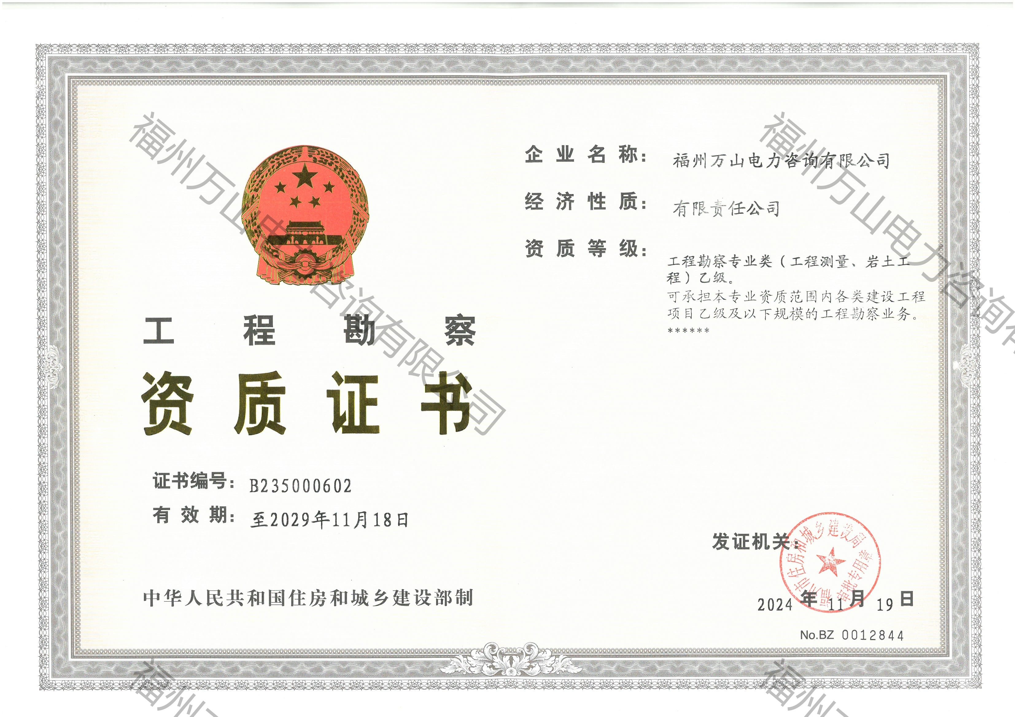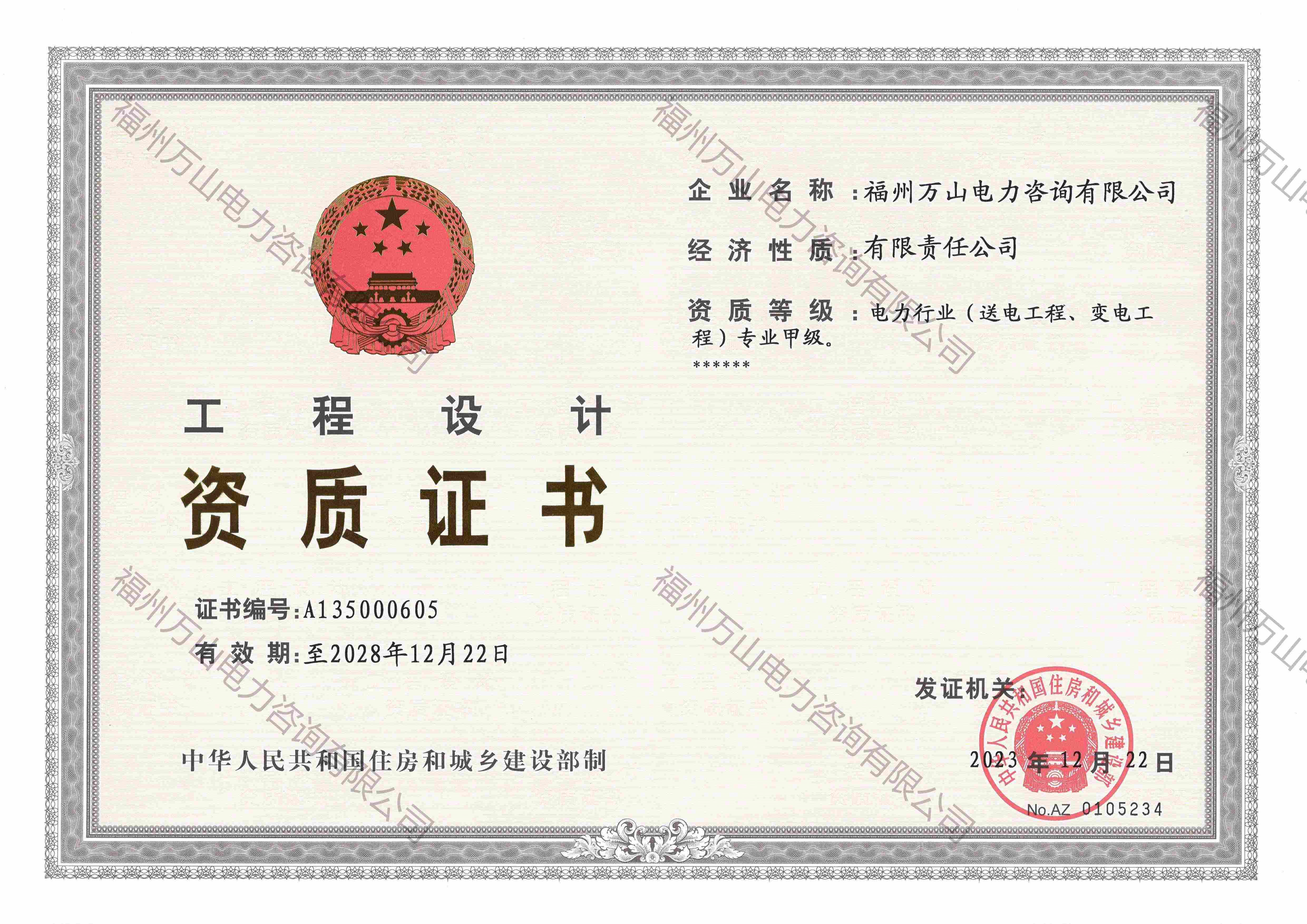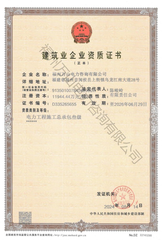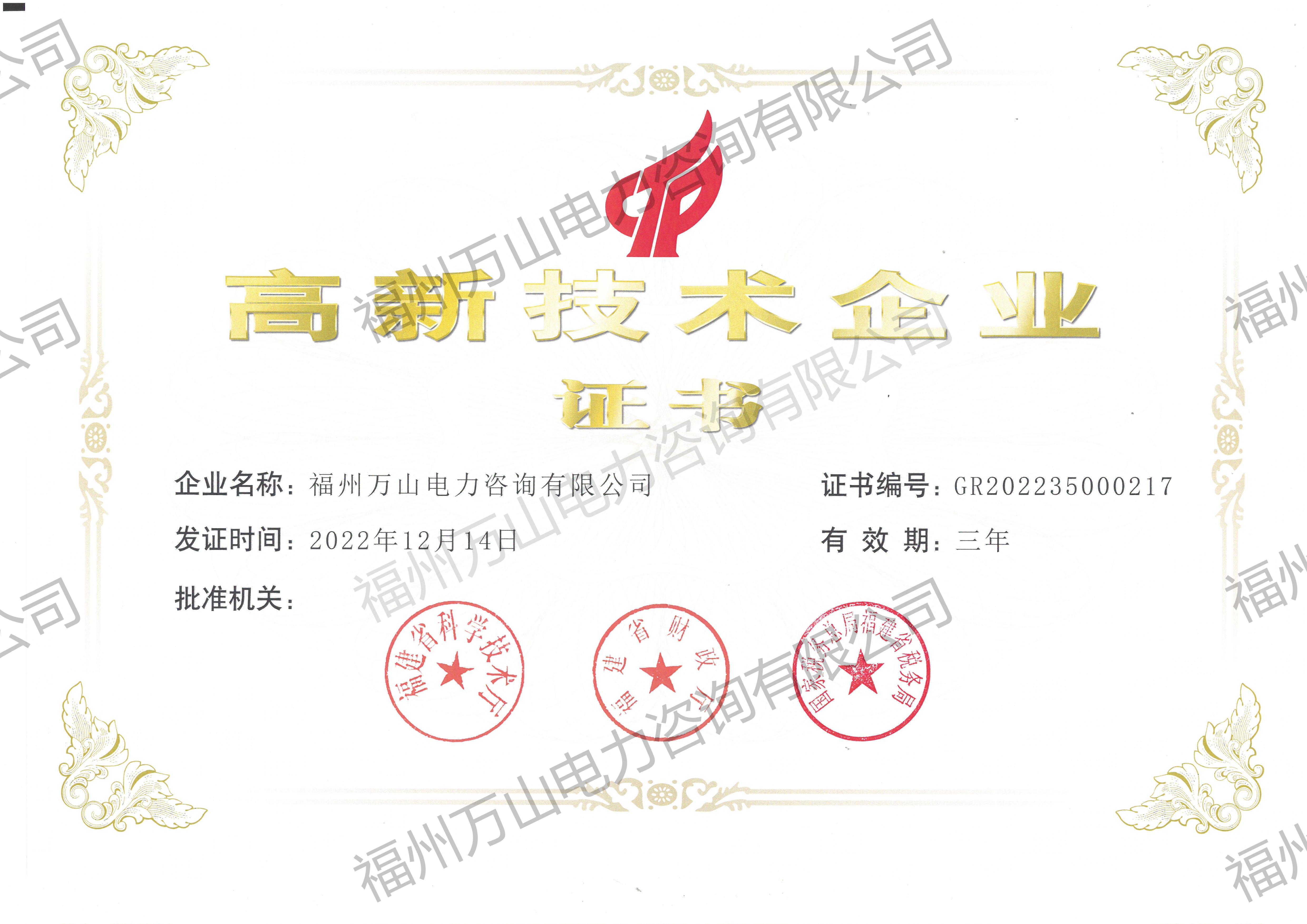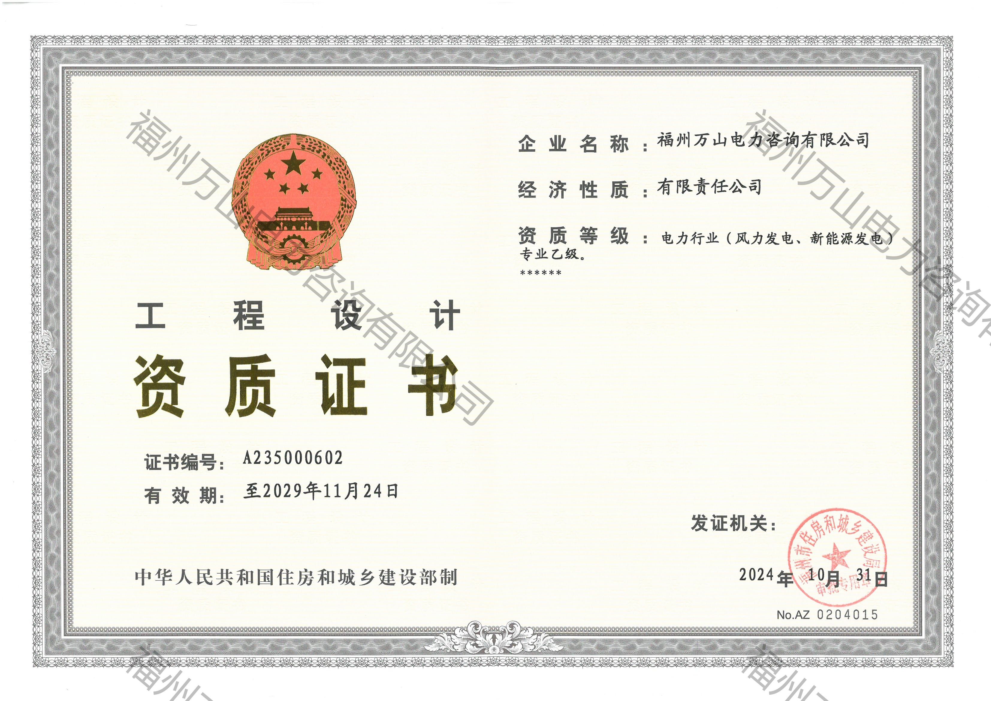 福州万山电力咨询有限公司创建于2006年,是一家致力于能源工程的规划设计、投资建设、运营维护等全过程服务的公司,被认定为国家高新技术企业、福建省科技型企业、福建省知识产权优势企业,具有电力设计(送电、变电工程)专业甲级、工程勘察(岩土工程、工程测量)乙级、电力设计(新能源发电、风力发电)专业乙级、建筑设计(建筑工程)专业乙级、工程咨询(电力)乙级、电力工程施工总承包叁级、对外承包工程等各类资质,是专业从事资质许可范围内能源工程的规划咨询、勘察设计、工程总承包、投资建设、运营维护等的综合技术服务企业。
