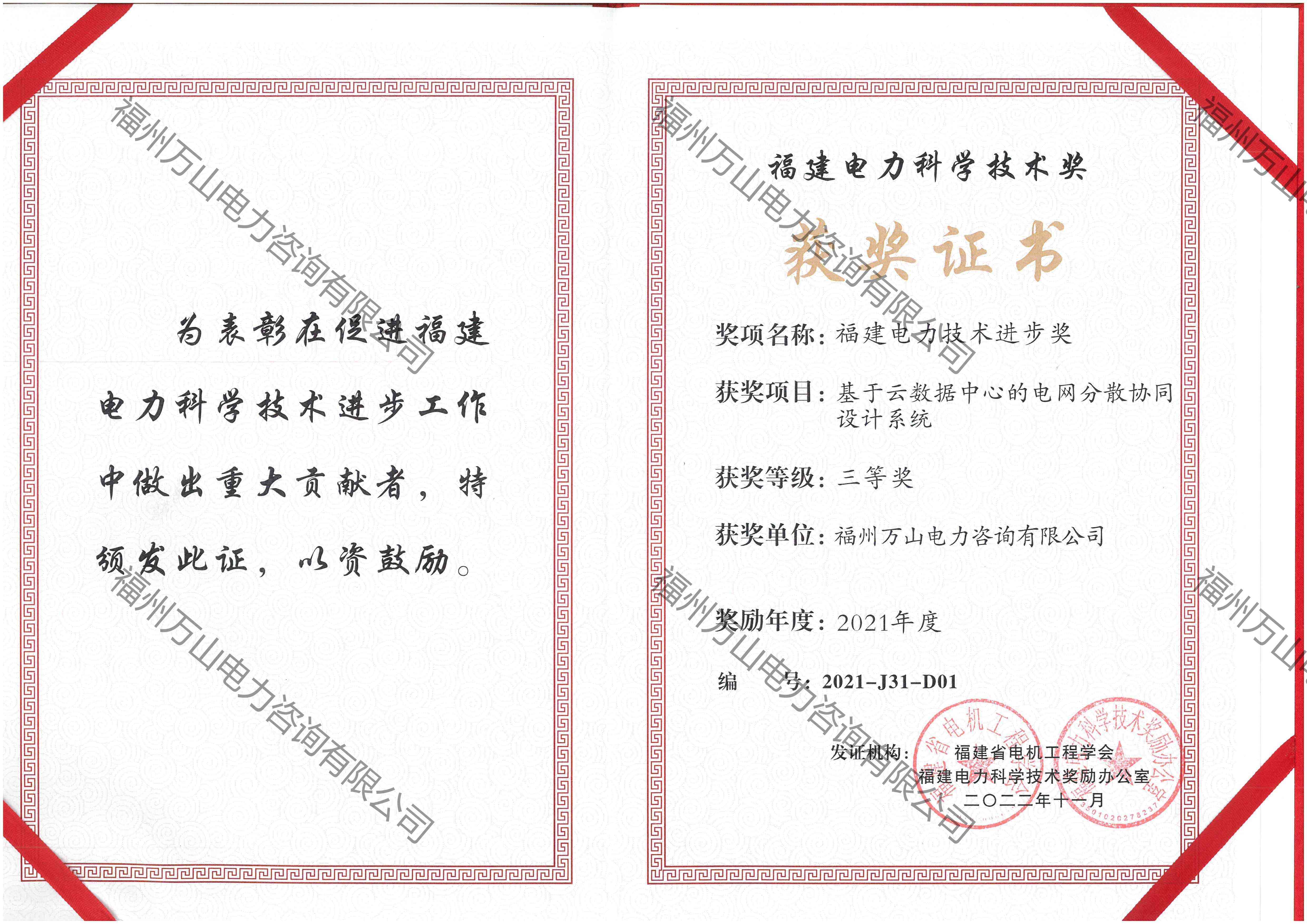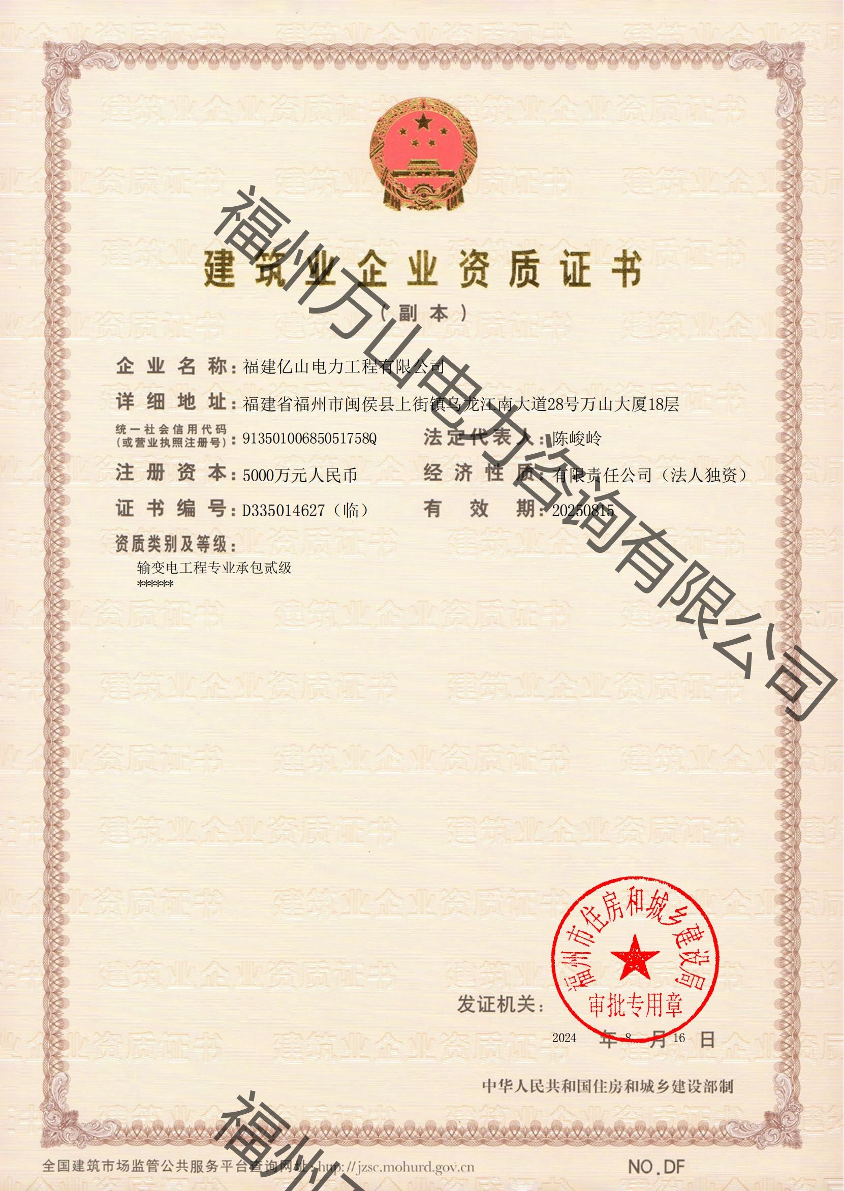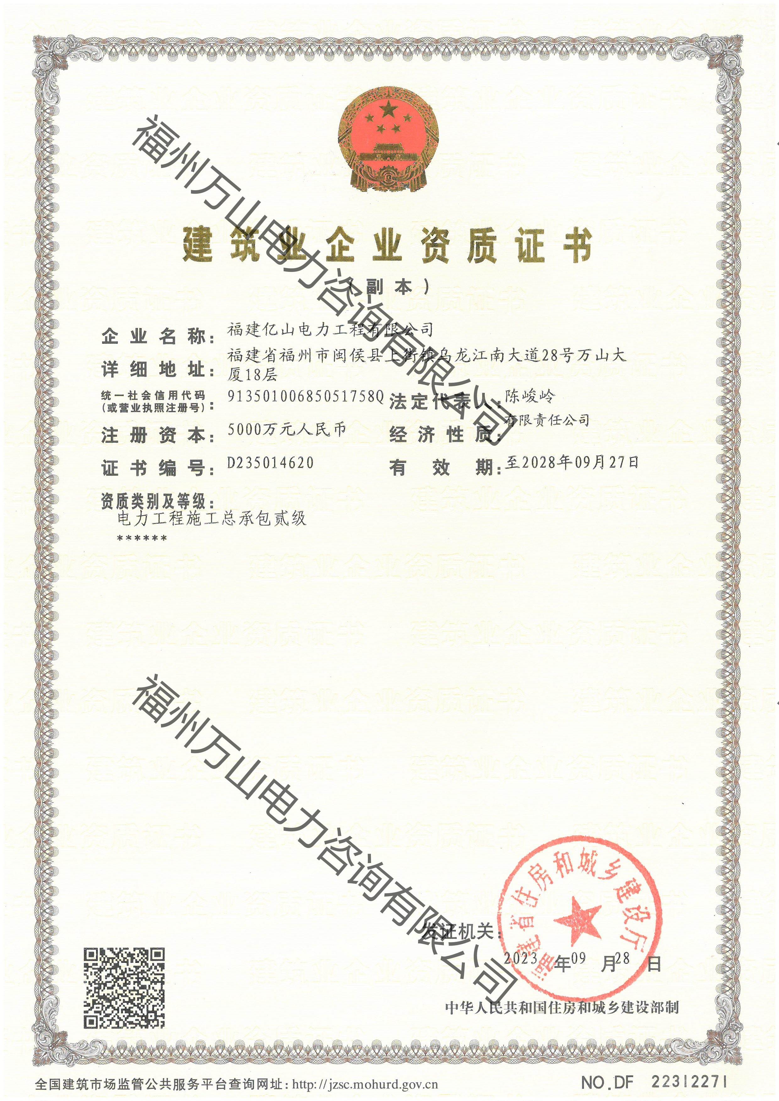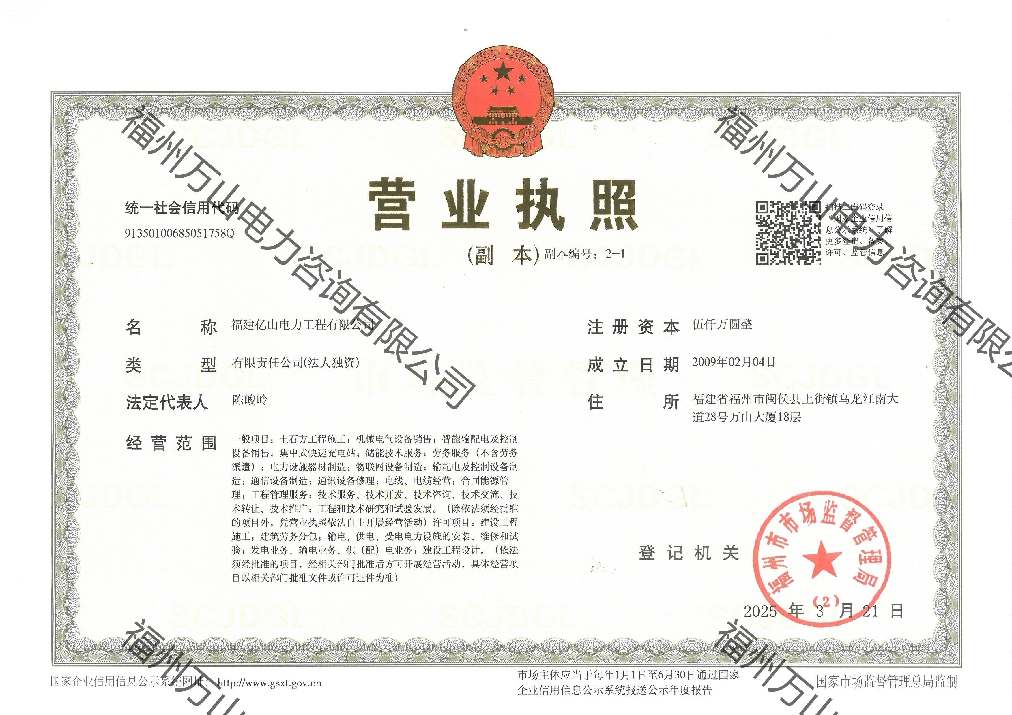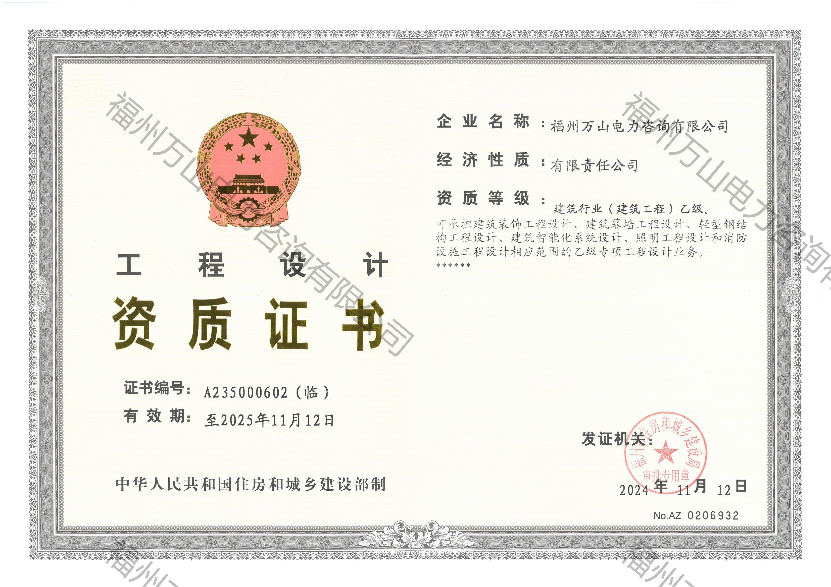 福州万山电力咨询有限公司创建于2006年,是一家致力于能源工程的规划设计、投资建设、运营维护等全过程服务的公司,被认定为国家高新技术企业、福建省科技型企业、福建省知识产权优势企业,具有电力设计(送电、变电工程)专业甲级、工程勘察(岩土工程、工程测量)乙级、电力设计(新能源发电、风力发电)专业乙级、建筑设计(建筑工程)专业乙级、工程咨询(电力)乙级、电力工程施工总承包叁级、对外承包工程等各类资质,是专业从事资质许可范围内能源工程的规划咨询、勘察设计、工程总承包、投资建设、运营维护等的综合技术服务企业。